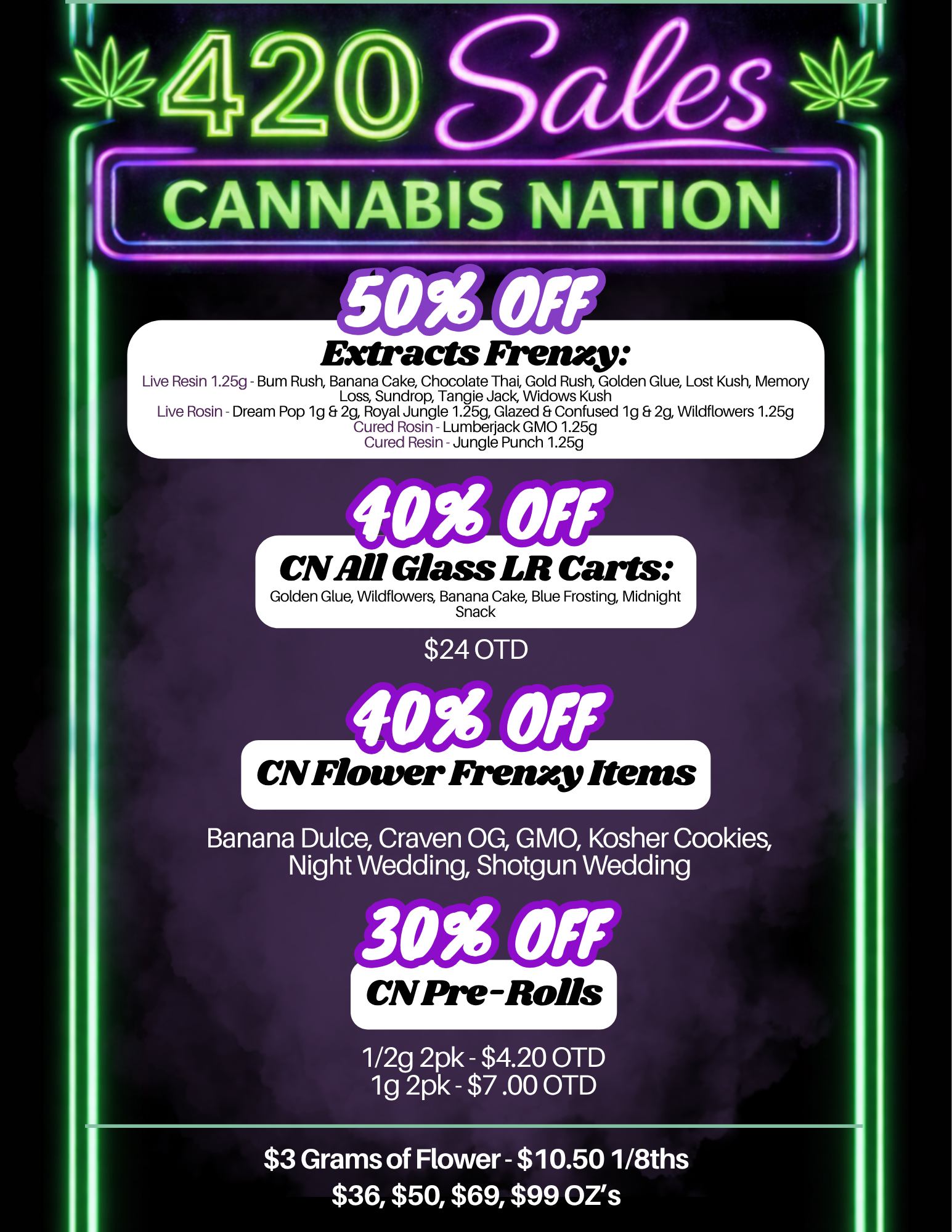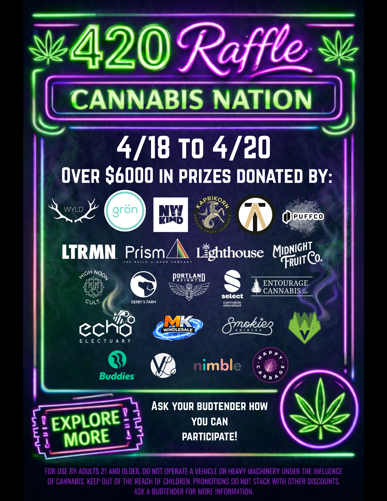 Promotions & Deals At Cannabis Nation, we ensure that there are plenty of ways for customers to save every day. Check out our daily deals, rotating promotions, and loyalty program for more ways to get more bud for less. ASTORIA BEAVERTON GRESHAM OREGON CITY SEASIDE SUNRIVER ASTORIA BEAVERTON GRESHAM OREGON CITY SEASIDE SUNRIVER